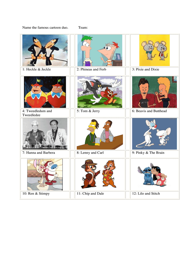 Name the famous cartoon duo. Team:1: Heckle & Jeckle2: Phineas and Ferb3: Pixie and Dixie4: Tweedledum and Tweedledee5: Tom & Jerry6: Basis and Butthead7: Hanna and Barbera8: Lenny and Carl9: Pinky