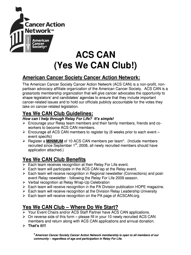 The ACS CAN Yes We CAN Club Guidelines is a personal form used by Relay For Life teams to outline participation details and recruit members for the American Cancer Society Cancer Action Network.