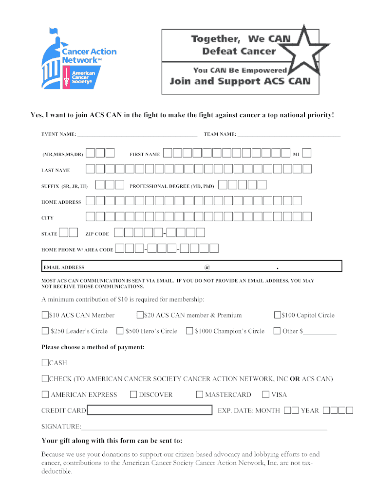 . . Yes, I want to join ACS CAN in the fight to make the fight against cancer a top national priority! EVENT NAME: (MR, MRS, MS, DR) TEAM NAME: FIRST NAME MI LAST NAME SUFFIX (SR, JR, III) PROFESSIONAL