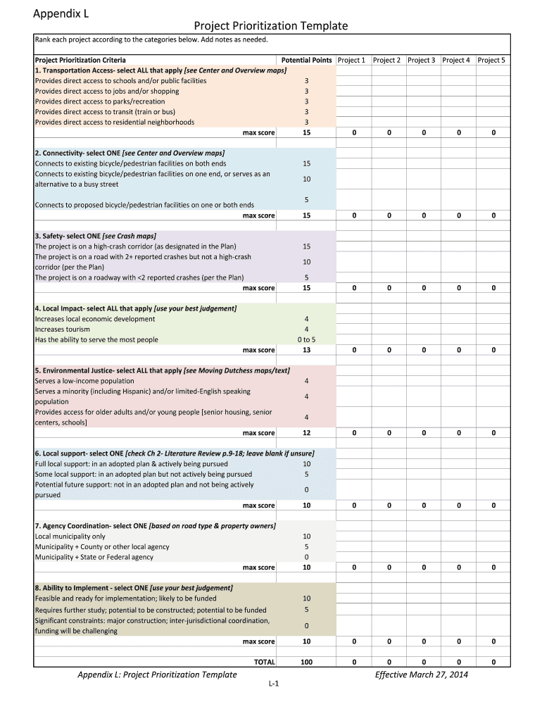 Appendix Project Prioritization TemplateRank each project according to the categories below. Add notes as needed. Project Prioritization Criteria Potential Points Project 1 1. Transportation Access