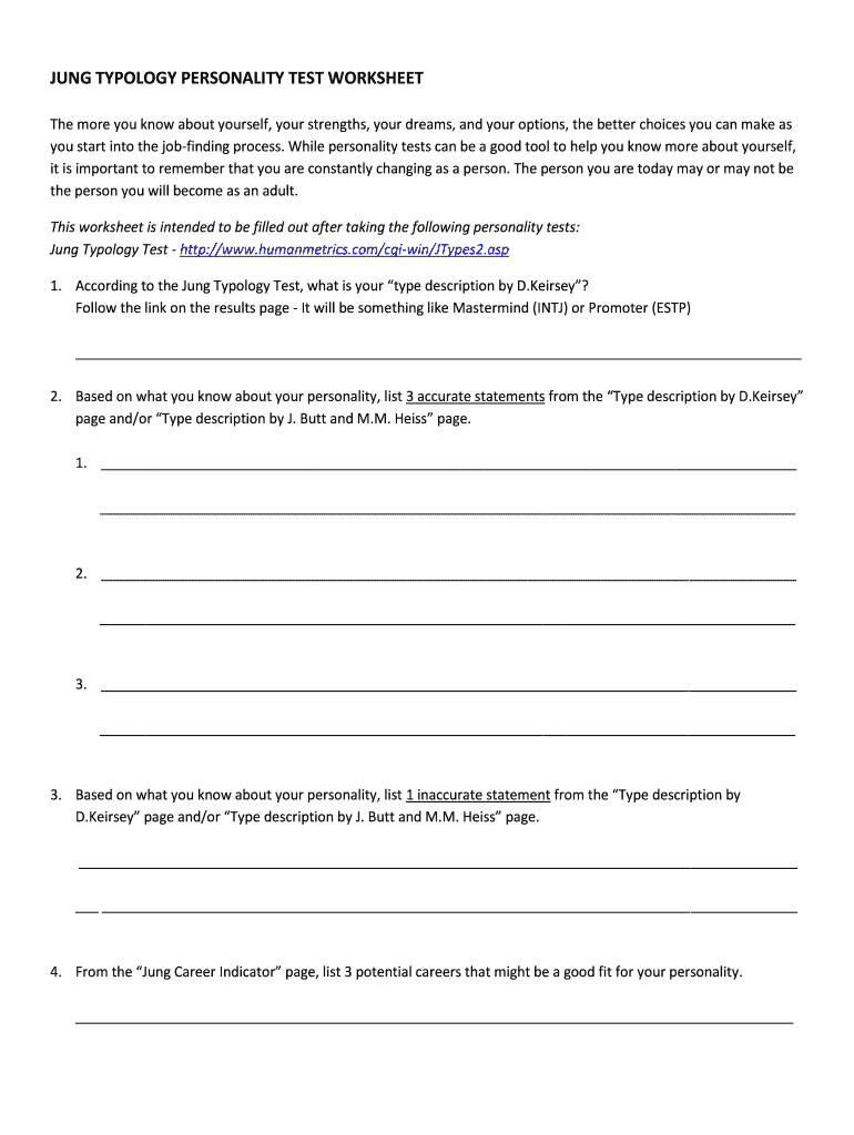 Get the free JUNG TYPOLOGY PERSONALITY TEST WORKSHEET