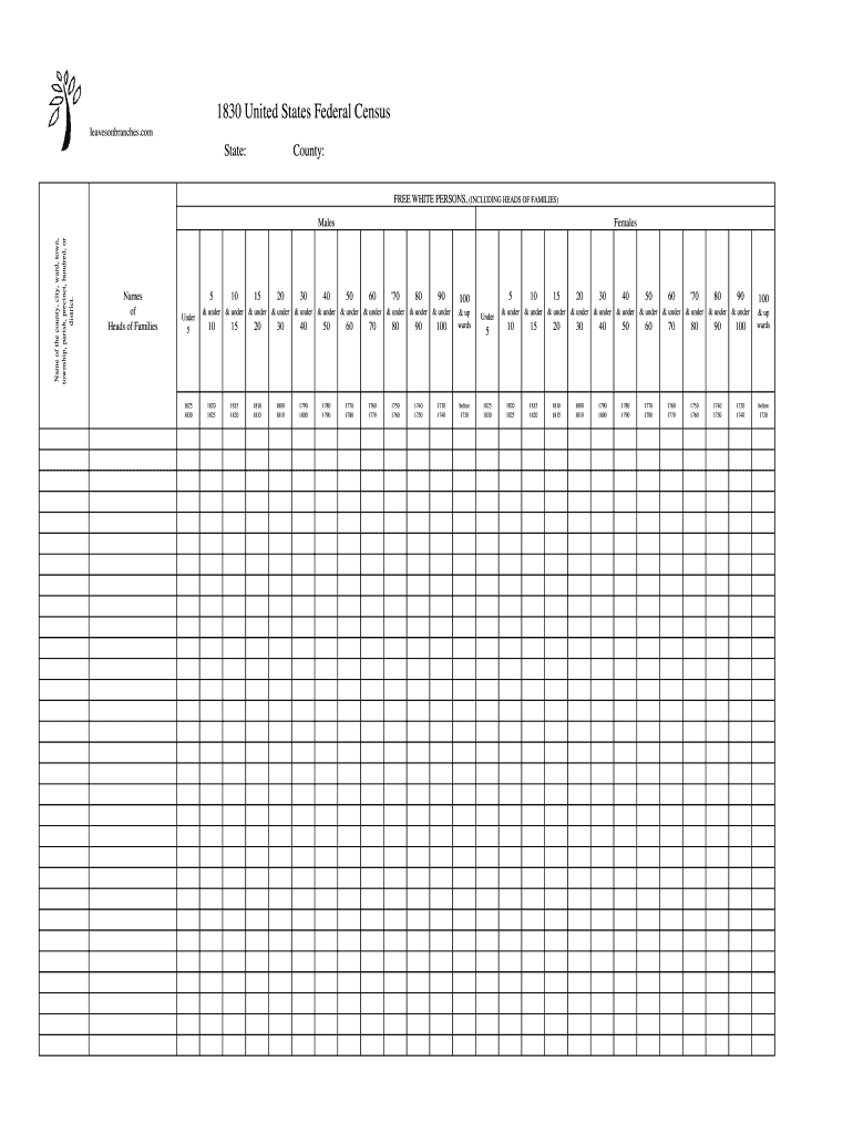 1830 United States Federal Census leavesonbranches.cogitate:County: FREE WHITE PERSONS, (INCLUDING HEADS OF FAMILIES)Name of the county, city, ward, town, township, parish, precinct, a hundred, or