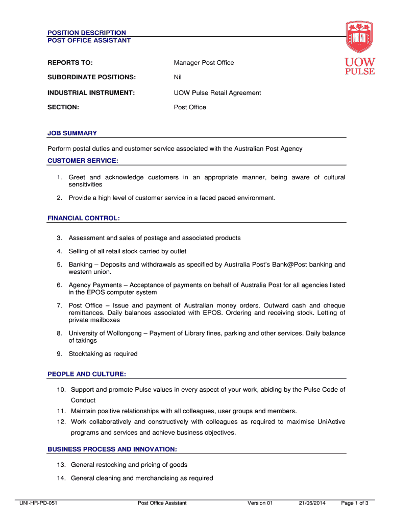 POST OFFICE ASSISTANTREPORTS TO:Manager Post OfficeSUBORDINATE POSITIONS:Nonindustrial INSTRUMENT:NOW Pulse Retail AgreementSECTION:Post Office SUMMARY