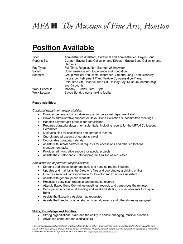 Work Location:Administrative Assistant, Curatorial and Administration, Bayou Bend