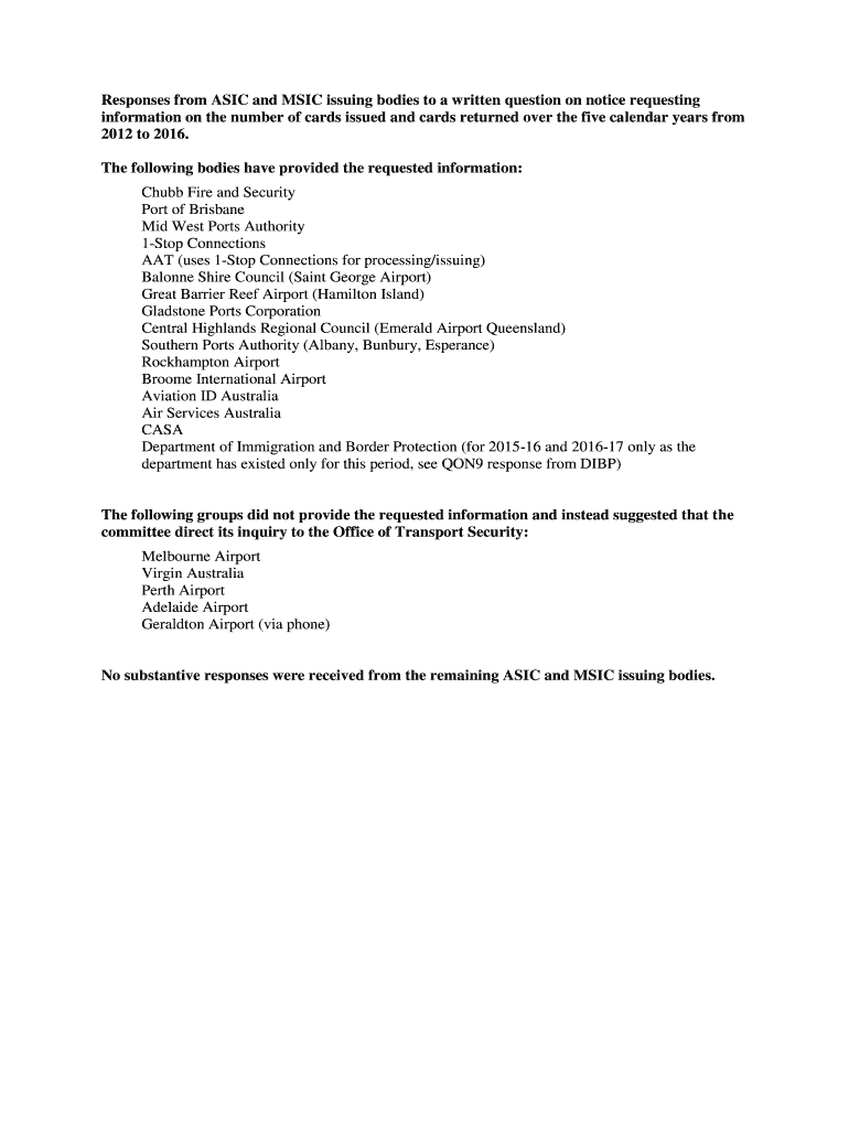 Get the free Responses from ASIC and MSIC issuing bodies to a written question on notice requesting