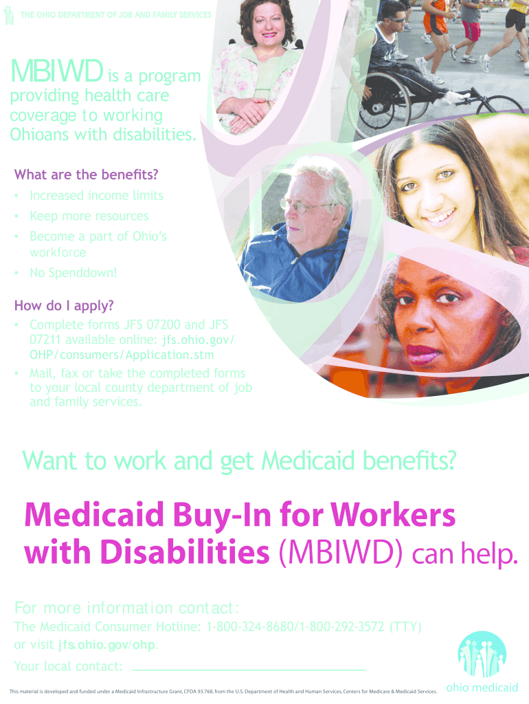 MBI WD is a program providing health care coverage to working Ohioans with disabilities. What are the benefits? Increased income limits Keep more resources Become a part of Ohio's workforce No Spends