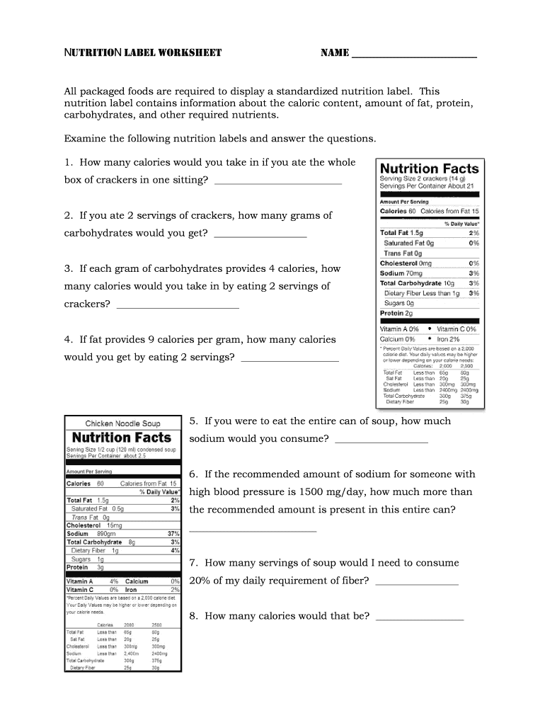 Nutrition label worksheet name All packaged foods are required to display a standardized nutrition label. This nutrition label contains information about the caloric content, amount of fat, protein,