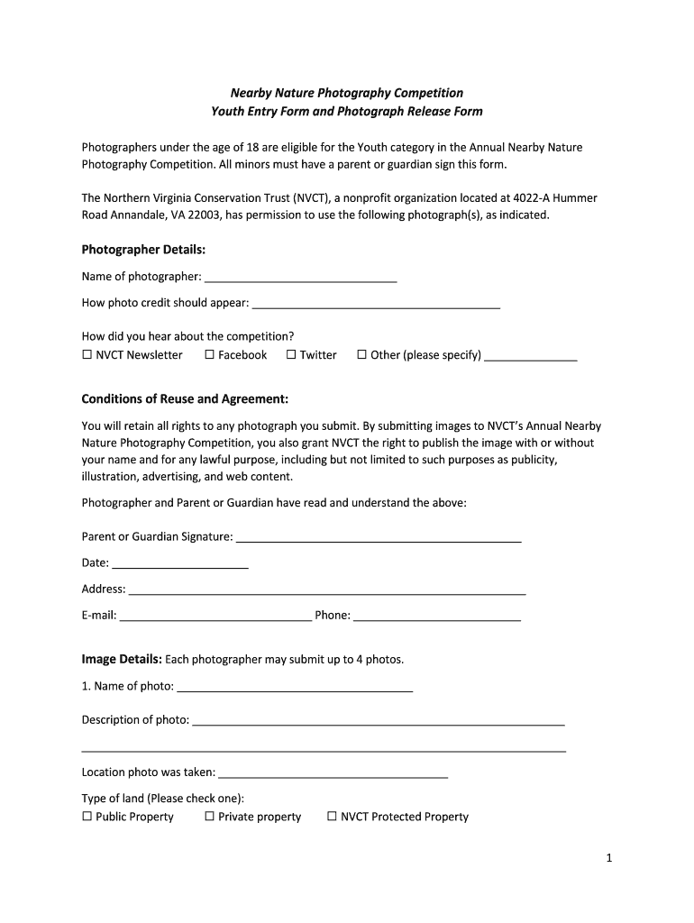 Nearby Nature Photography Competition Youth Entry Form and Photograph Release Form Photographers under the age of 18 are eligible for the Youth category in the Annual Nearby Nature Photography Competition.