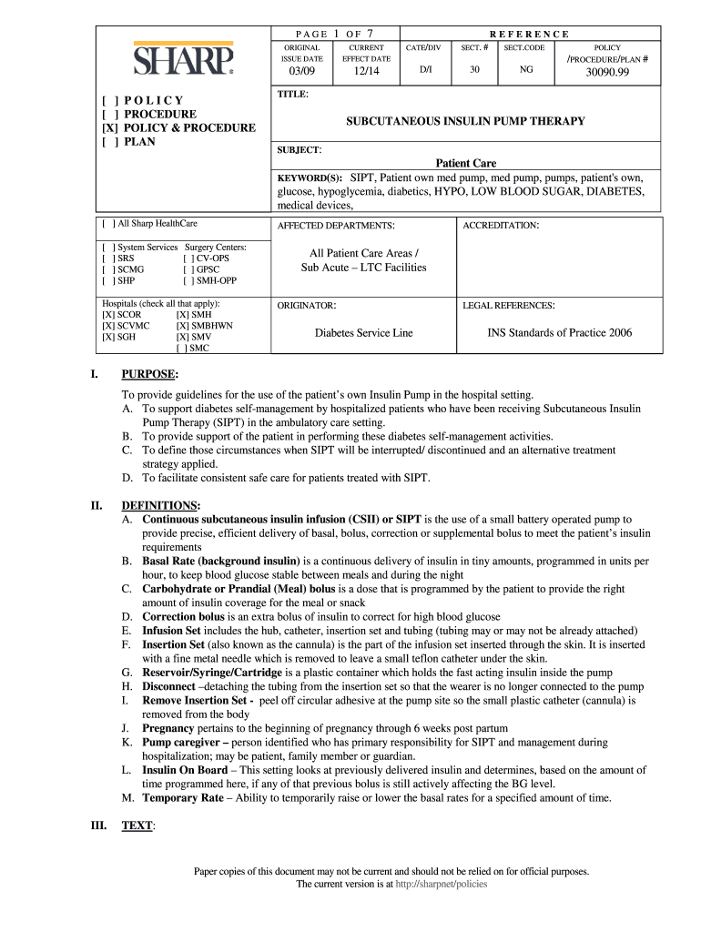 PAGE X POLICY PROCEDURE POLICY & PROCEDURE PLAN1 OF 7ORIGINAL ISSUE DETERRENT EFFECT DATE03/0912/14CATE/DISSECT. #REFERENCE SECT.CODEPOLICY/PROCEDURE/PLAN # D/I30NG30090.99TITLE:SUBCUTANEOUS INSULIN