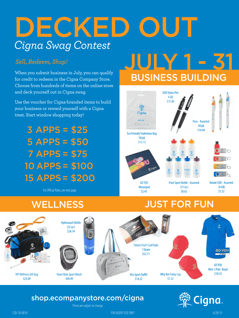 DECKED OUT Cagney Swag Contest Sell, Redeem, Shop! When you submit business in July, you can qualify for credit to redeem in the Cagney Company Store. Choose from hundreds of items on the online store