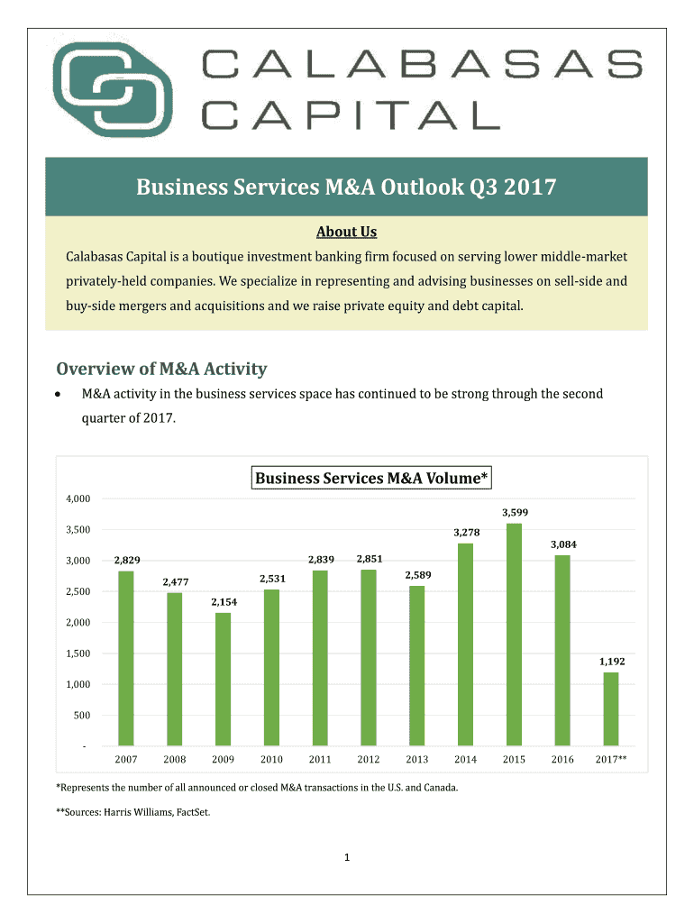 Business Services M&A Outlook Q3 2017 About Us Calabasas Capital is a boutique investment banking firm focused on serving lower middle market privately held companies. We specialize in representing