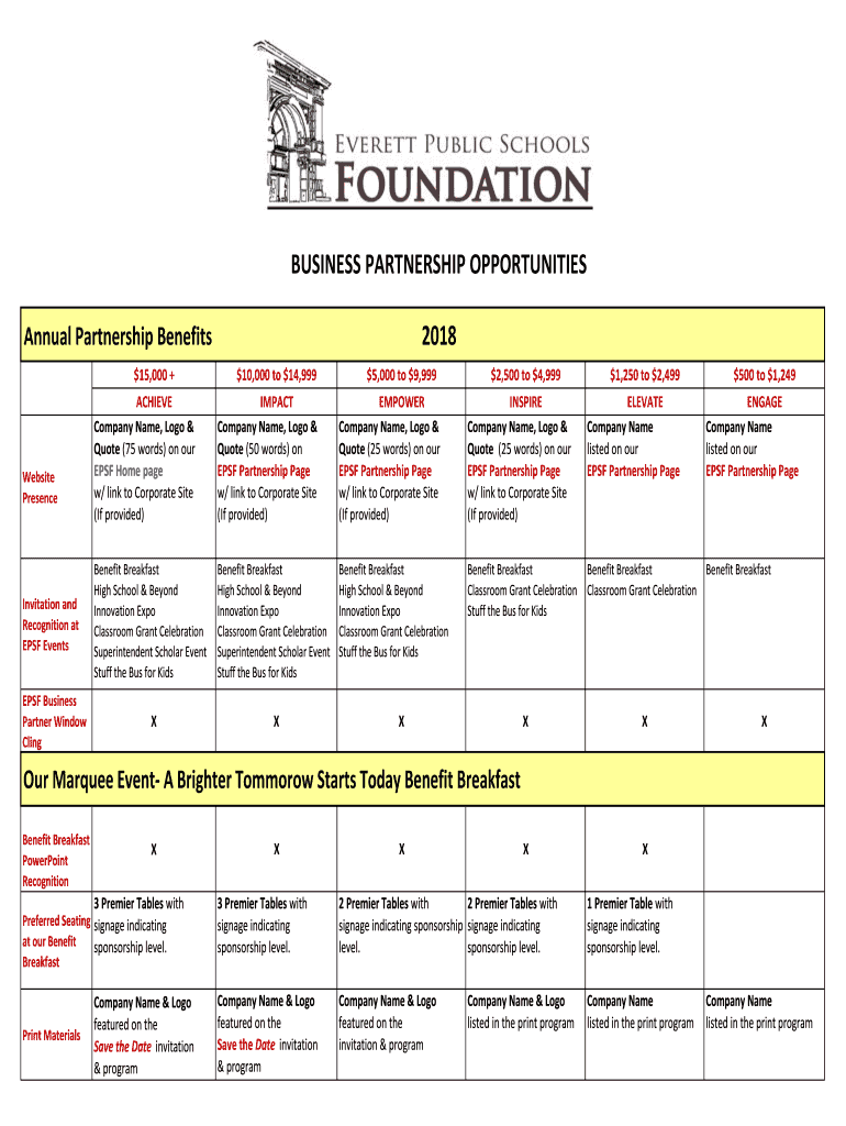 BUSINESS PARTNERSHIP OPPORTUNITIES 2018Annual Partnership Benefits $15,000 +Website PresenceInvitation and Recognition at EPSF Events EPSF Business Partner Window Cling×10,000 to $14,999×5,000 to