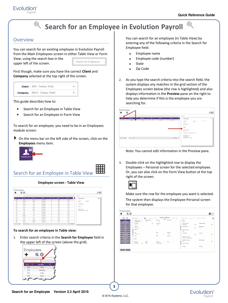 Quick Reference GuideStar for an Employee in Evolution Payroll You can search for an employee (in Table View) by entering any of the following criteria in the Search for Employee field:Overview You
