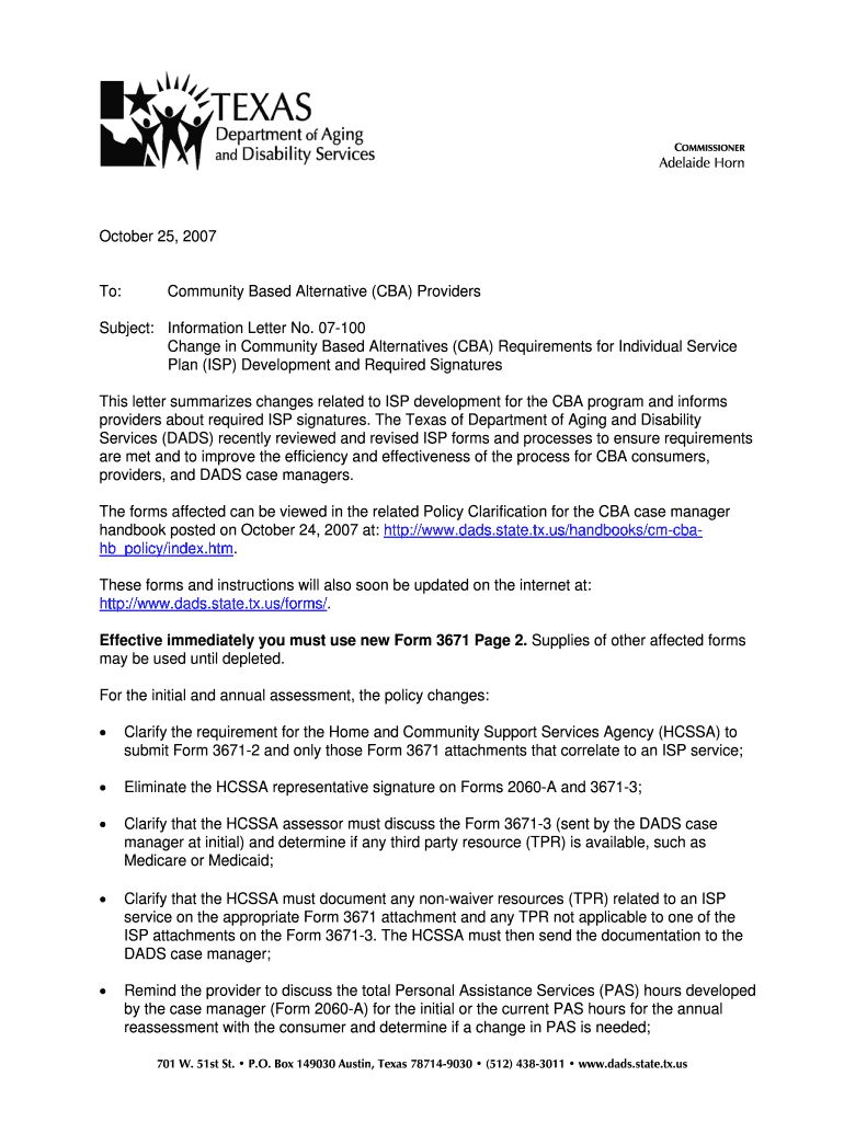 COMMISSIONER Adelaide Horn October 25, 2007To:Community Based Alternative (CBA) ProvidersSubject: Information Letter No. 07100