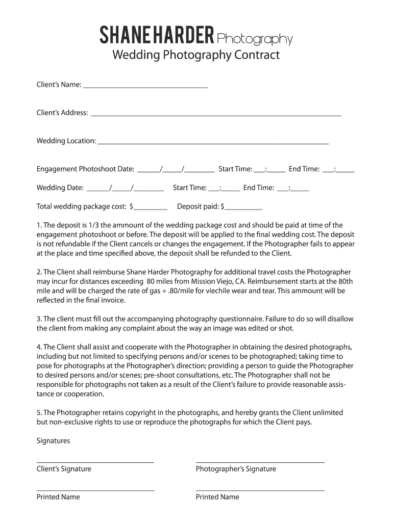 Shane Harder Photography Wedding Photography ContractClients Name: Clients Address: Wedding Location: Engagement Photoshoot Date: / / Start Time: : End Time: : Wedding Date: / / Total wedding package