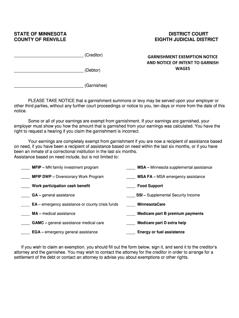 STATE OF MINNESOTA COUNTY OF RENVILLE (Creditor) (Debtor)DISTRICT COURT EIGHTH JUDICIAL DISTRICTGARNISHMENT EXEMPTION NOTICE AND NOTICE OF INTENT TO GARNISH WAGES (Garnishee)PLEASE TAKE NOTICE that
