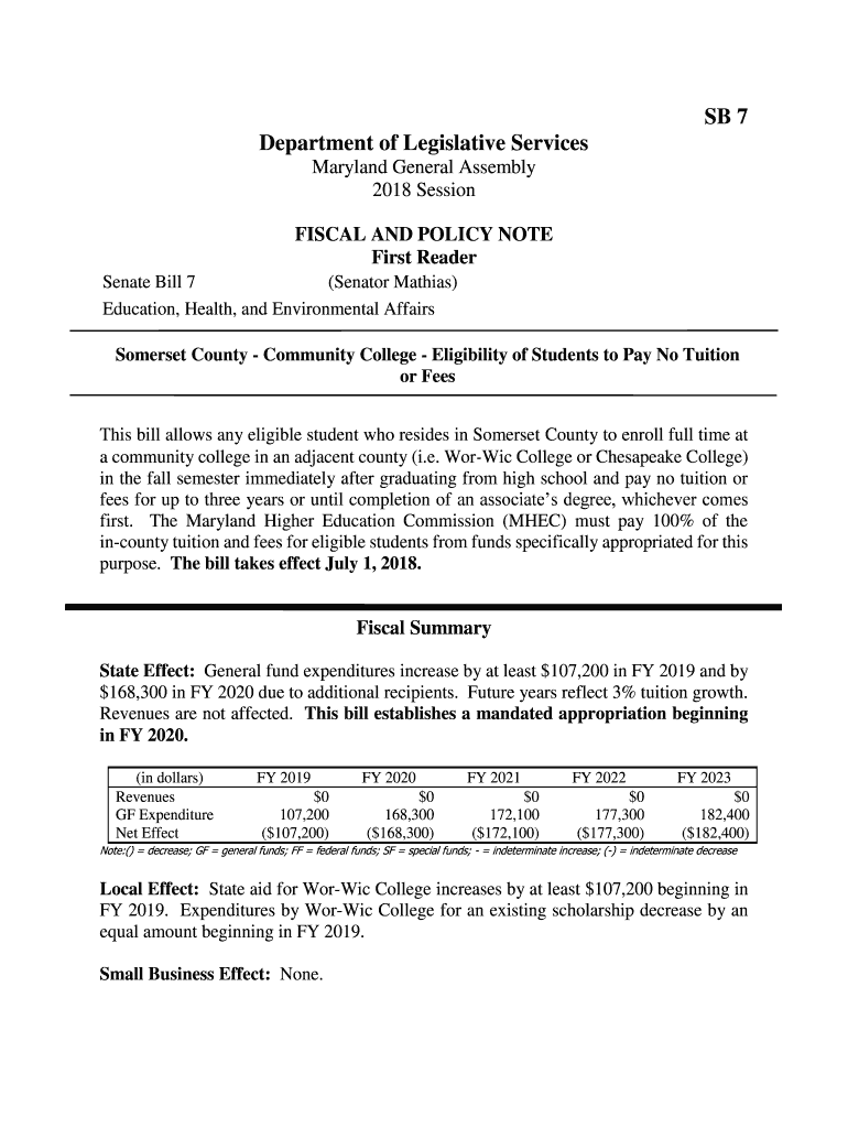 SB 7 Department of Legislative Services Maryland General Assembly 2018 Session FISCAL AND POLICY NOTE First Reader Senate Bill 7 (Senator Mathias) Education, Health, and Environmental Affairs Somerset