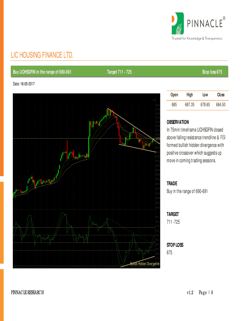LIC HOUSING FINANCE LTD. Buy LICHSGFIN in the range of 690691Target 711 725Stop loss 675Date: 16052017OpenHighLowClose685687.35678.65684.50OBSERVATION In 75min timeframe LICHSGFIN closed above falling