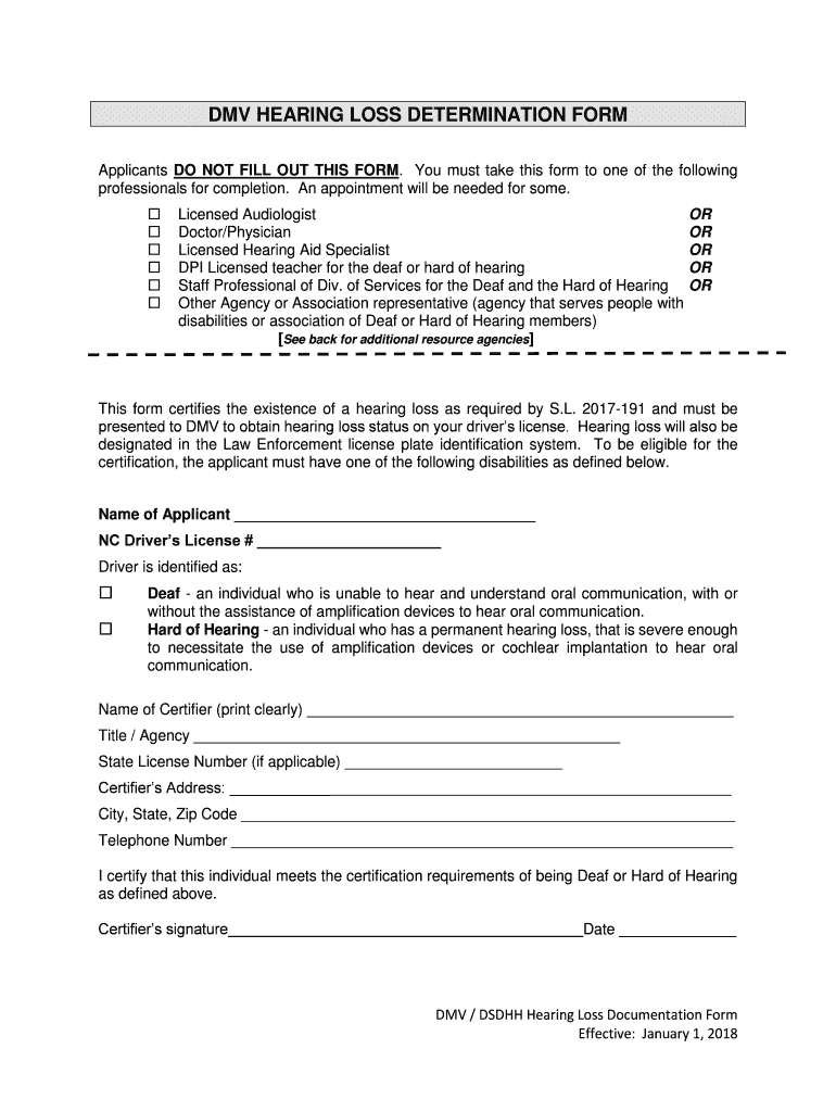 DMV HEARING LOSS DETERMINATION FORM Applicants DO NOT FILL OUT THIS FORM. You must take this form to one of the following professionals for completion. An appointment will be needed for some. Licensed
