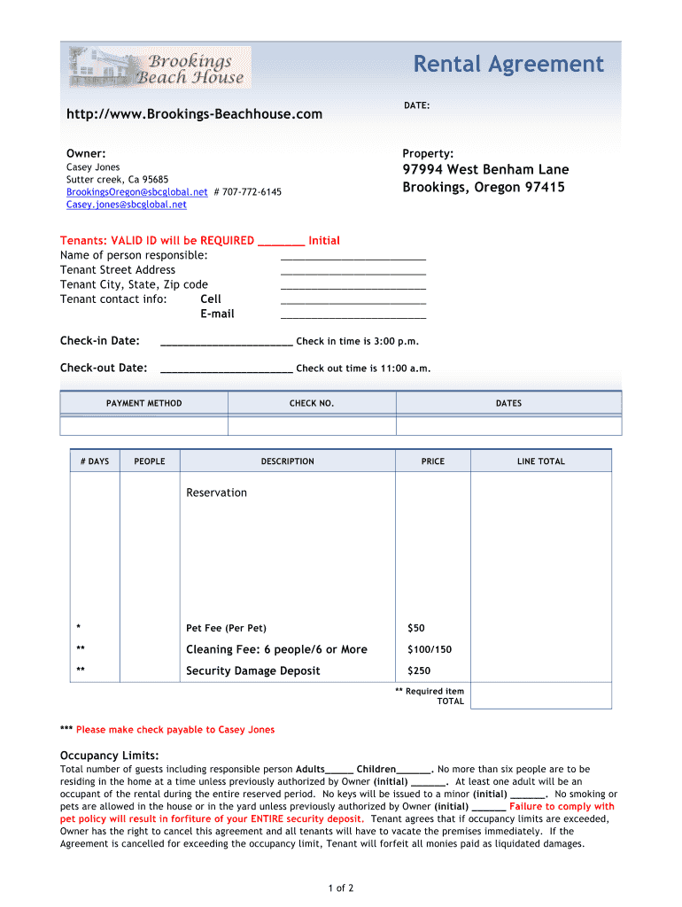 Rental Agreement DATE:http://www.BrookingsBeachhouse.com Owners:Property:Casey and Tracie Jones 736 Paula Lane Petaluma, CA 94952 BrookingsOregon global.net # 707480486797994 West Bentham Lane Brookings,