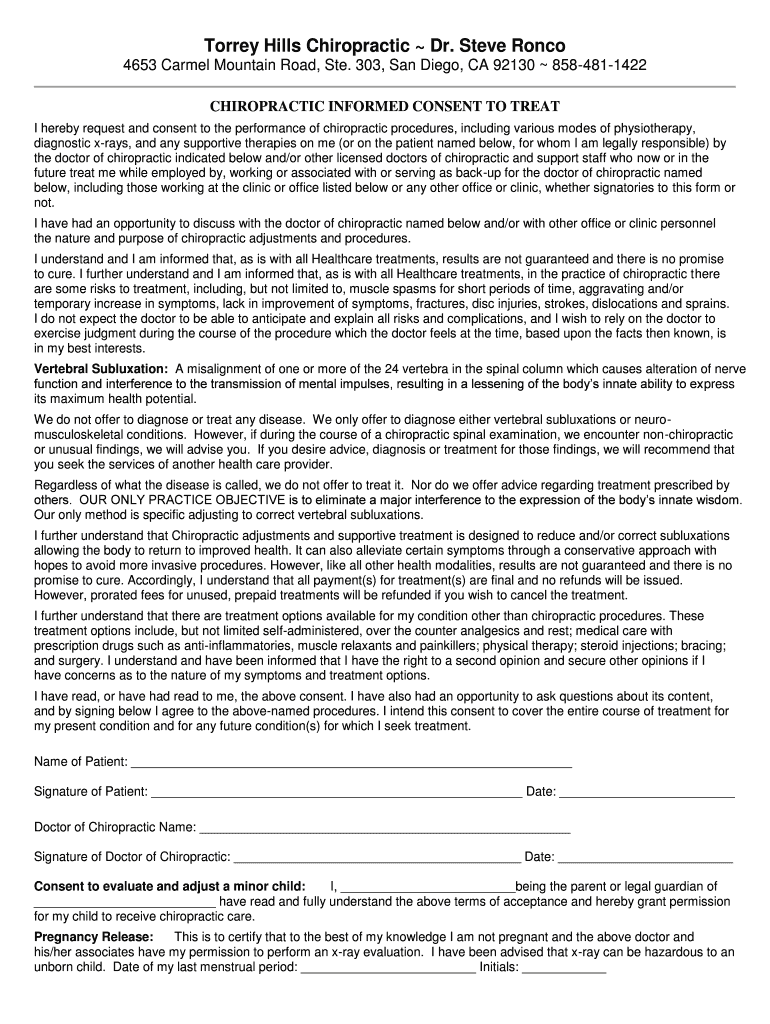 The Chiropractic Informed Consent Form must be filled out by patients seeking chiropractic treatment, doctors of chiropractic practitioners, and parents or legal guardians of minor patients.