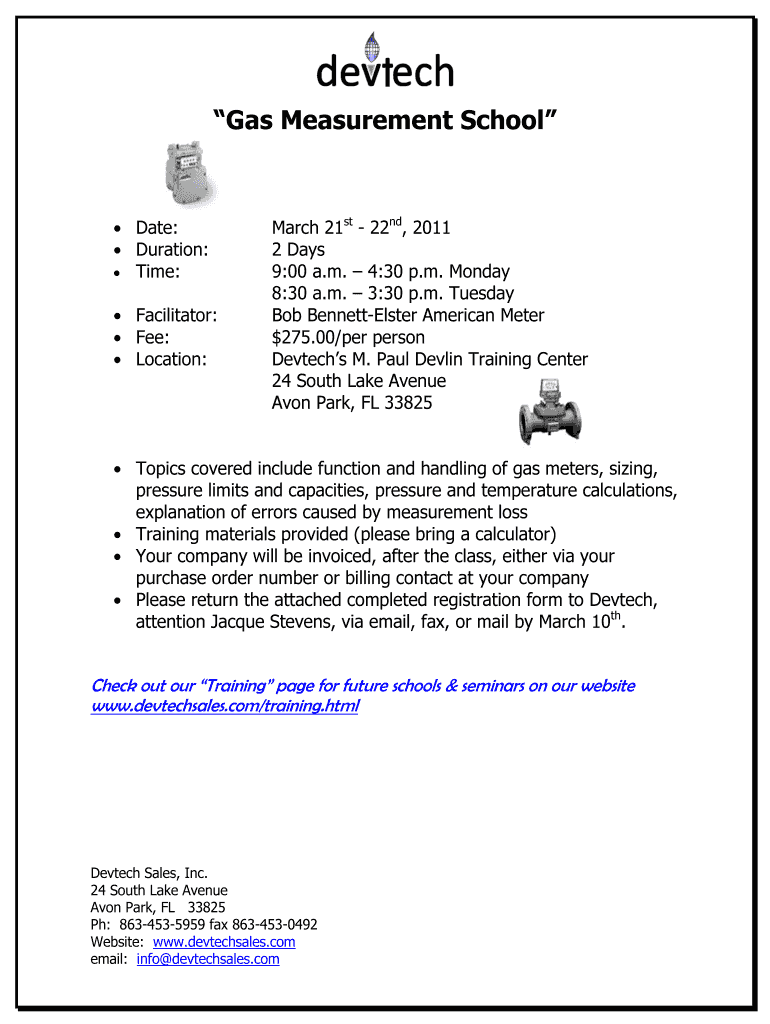 Gas Measurement Schoolmate: Duration: Time: Facilitator: Fee: Location:March 21st 22nd, 2011 2 Days 9:00 a.m. 4:30 p.m. Monday 8:30 a.m. 3:30 p.m. Tuesday Bob BennettElster American Meter $275.00/per