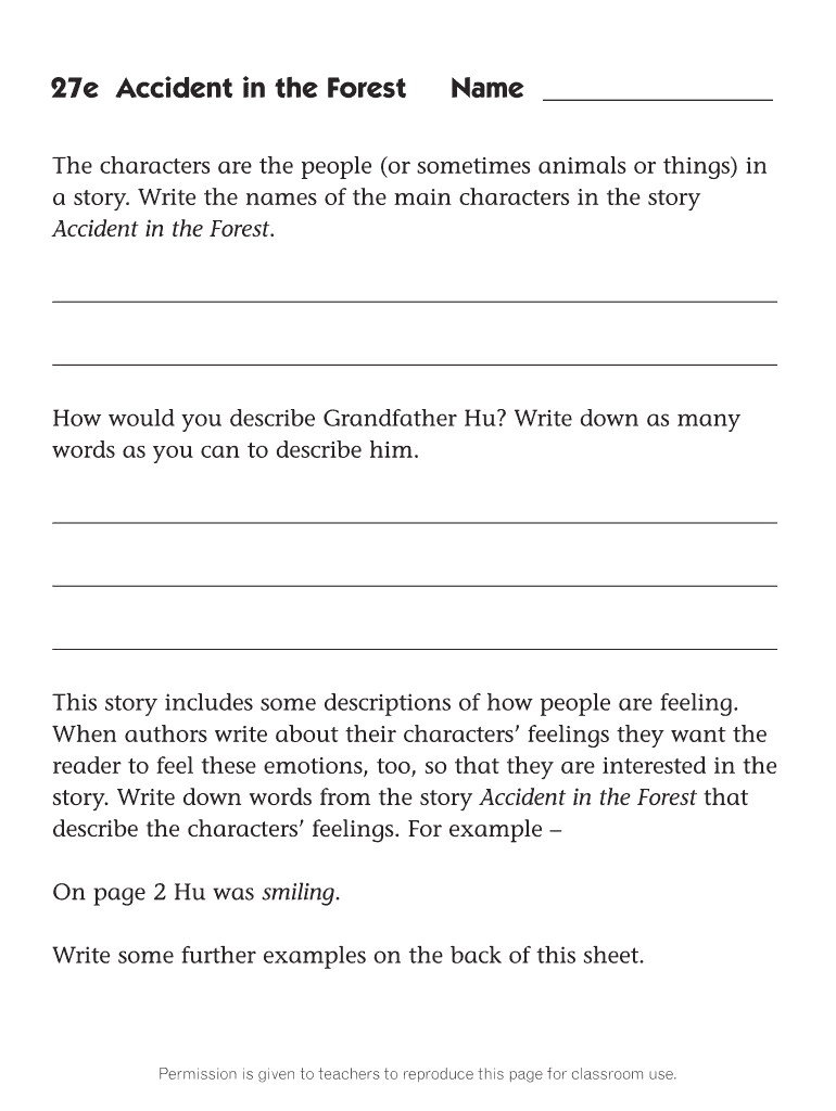 27e Accident in the Forename The characters are the people (or sometimes animals or things) in a story. Write the names of the main characters in the story Accident in the Forest. How would you describe