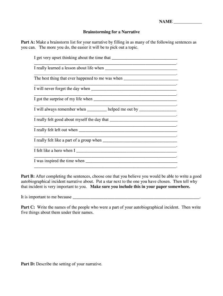 NAME Brainstorming for a Narrative Part A: Make a brainstorm list for your narrative by filling in as many of the following sentences as you can. The more you do, the easier it will be to pick out