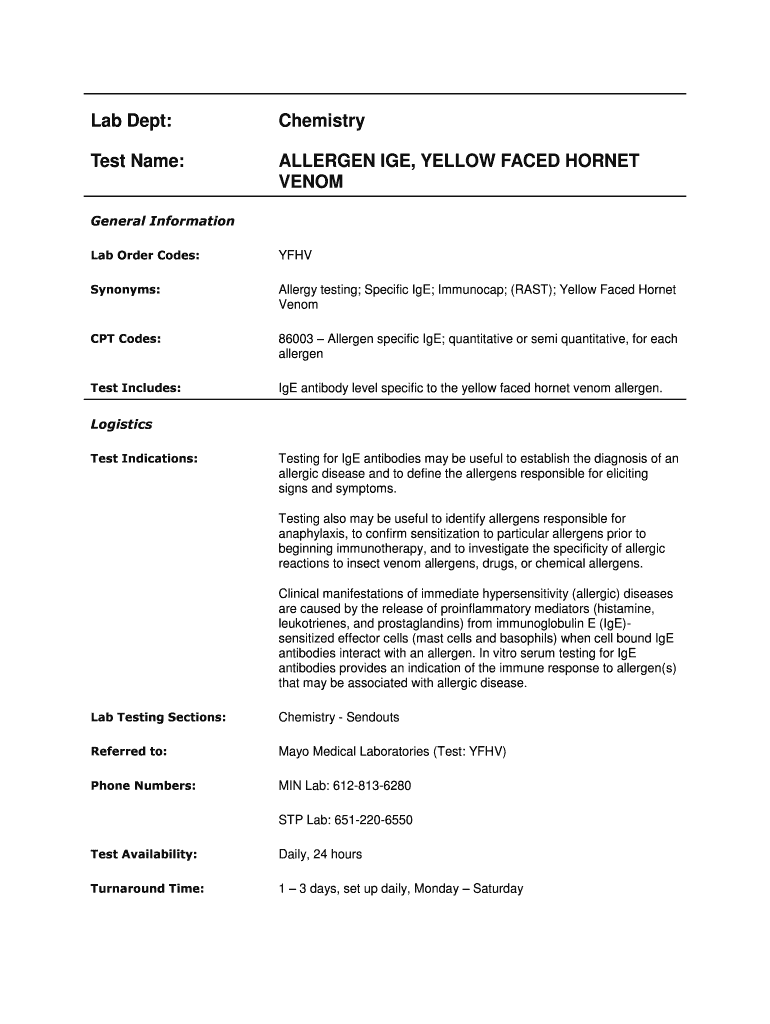 Lab Dept:Chemistries Name:ALLERGEN IGE, YELLOW FACED HORNET VENOMGeneral Information Lab Order Codes:YFHVSynonyms:Allergy testing; Specific IGE; Immunogen; (LAST); Yellow Faced Hornet Venom Codes:86003