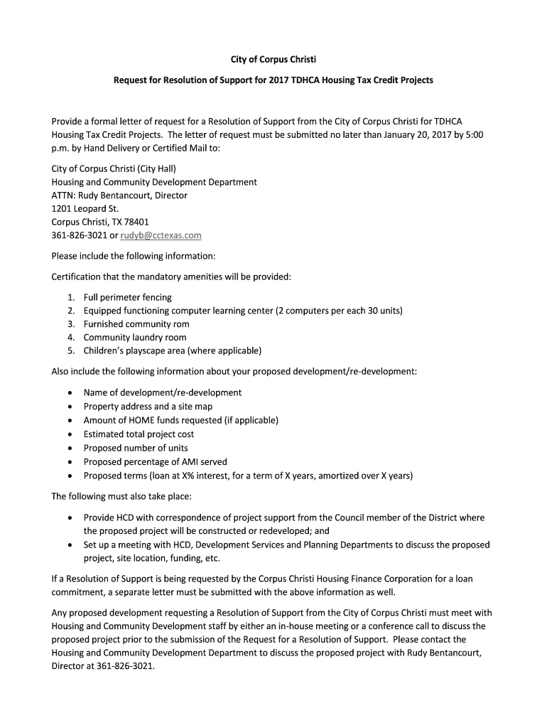 Request for Resolution of Support for 2017 TD HCA Housing Tax Credit ProjectsProvide a formal letter of request for a Resolution of Support from the City of Corpus Christi for