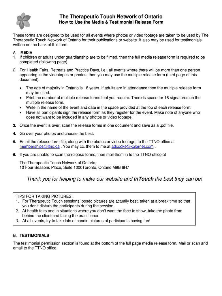 The Therapeutic Touch Network of Ontario How to Use the Media & Testimonial Release Form These forms are designed to be used for all events where photos or video footage are taken to be used by The