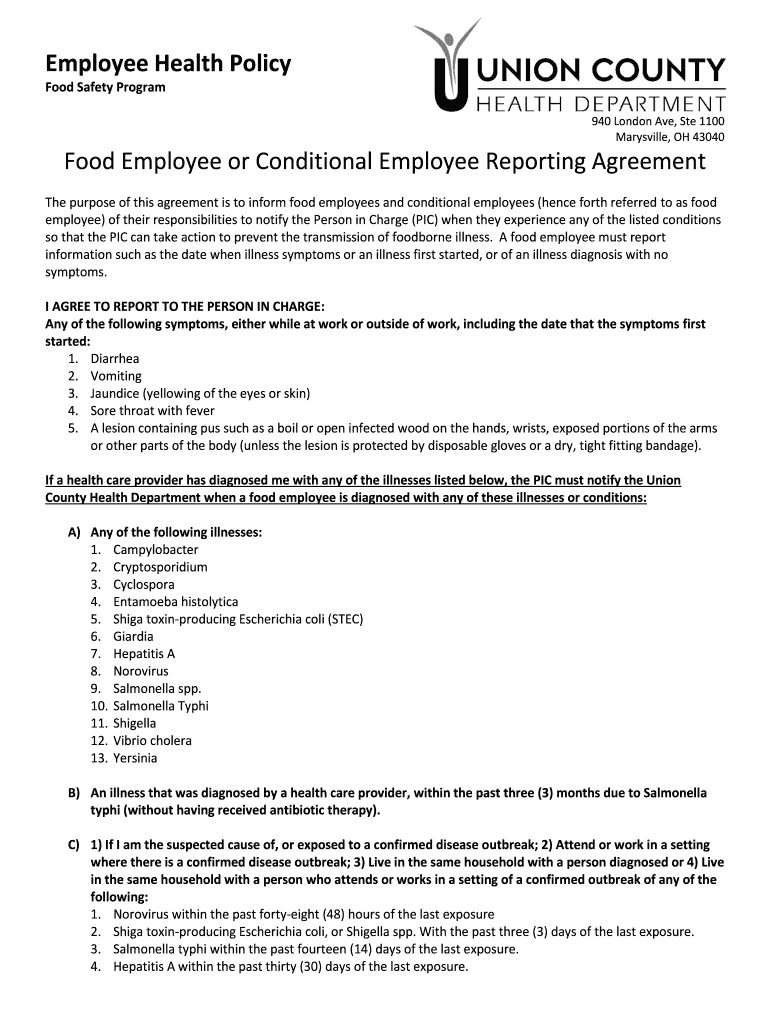Marysville, OH 43040Food Employee or Conditional Employee Reporting Agreement