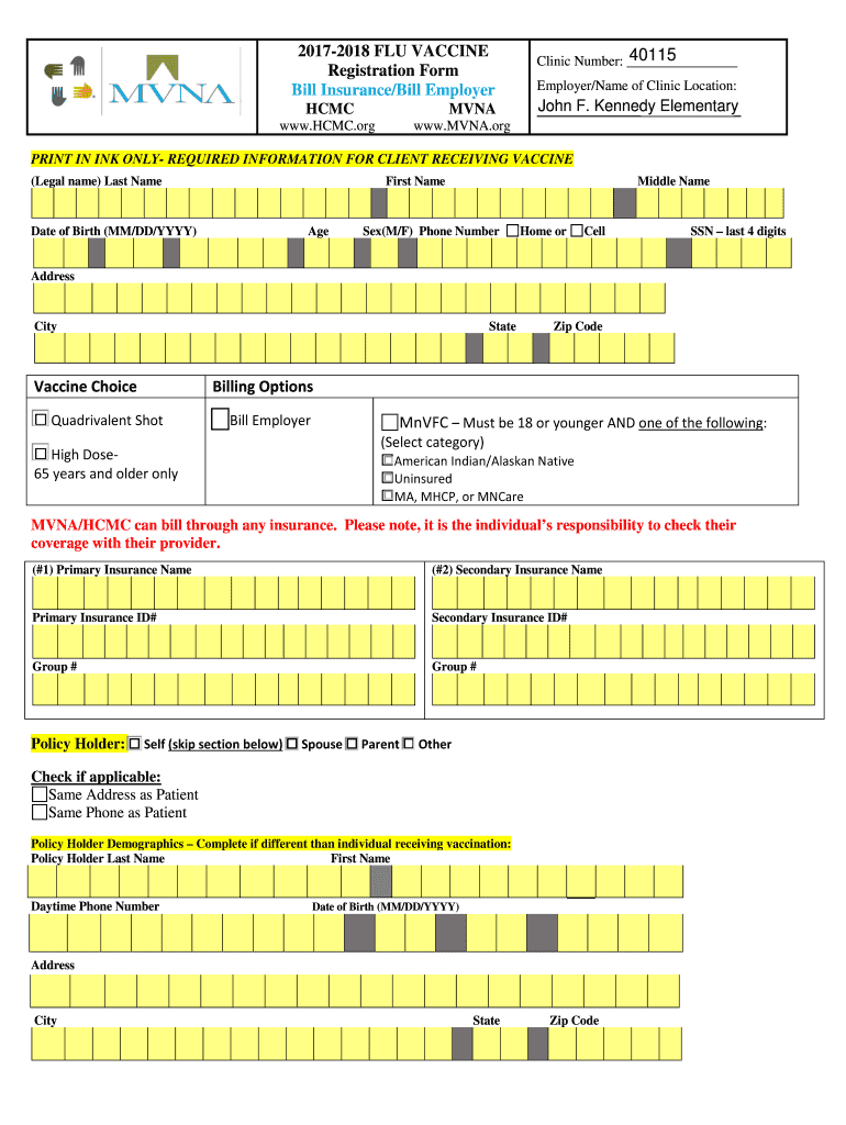 20172018 FLU VACCINE Registration Form Bill Insurance/Bill Employer HCMCMVNAwww.HCC.org40115 Clinic Number: Employer/Name of Clinic Location:John F. Kennedy Elementary www.MVNA.orgPRINT IN INK ONLY