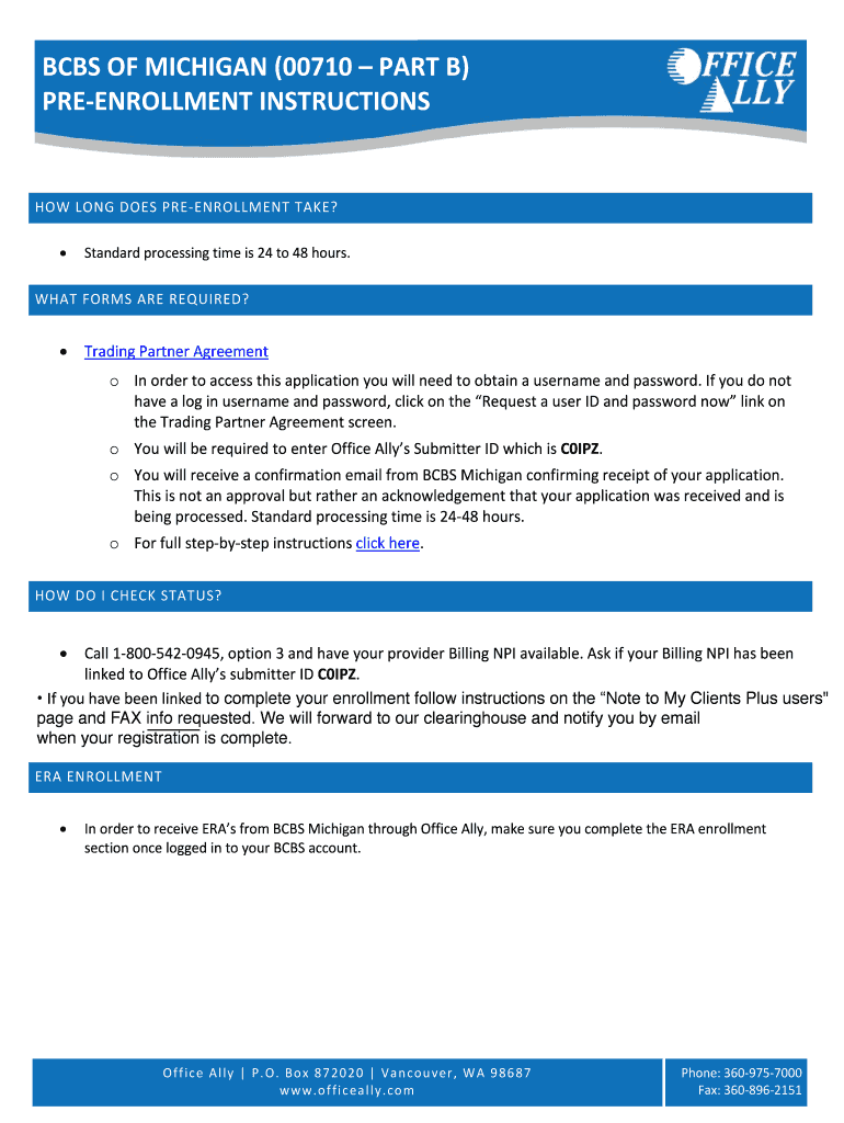 BCBS OF MICHIGAN (00710 PART B) ENROLLMENT INSTRUCTIONS LONG DOES ENROLLMENT TAKE? Standard processing time is 24 to 48 hours. WHAT FORMS ARE REQUIRED? Trading Partner Agreement o In order to access