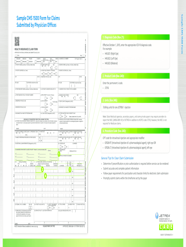 Sample CMS 1500 Form Sample CMS 1500 Form for Claims Submitted by Physician Officer example: Enter the permanent Code. injectionNote: State Medicaid agencies, secondary payers, and some private payers