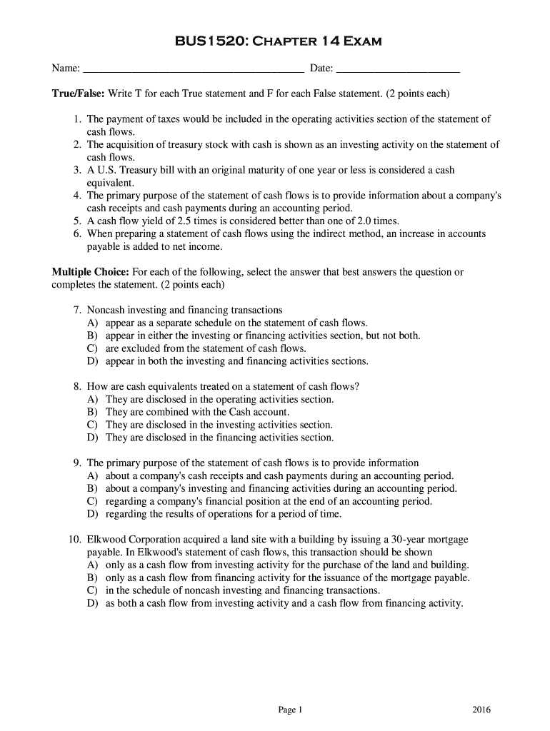 BUS1520: Chapter 14 Exam Name: Date: True/False: Write T for each True statement and F for each False statement. (2 points each) 1. The payment of taxes would be included in the operating activities