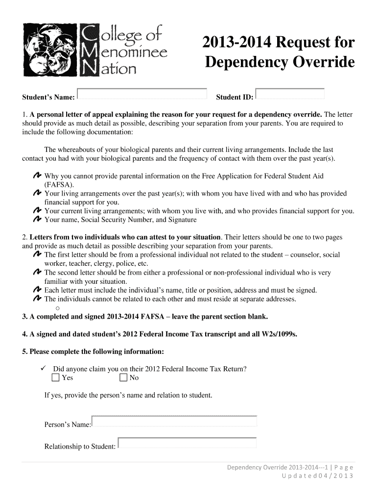 To be eligible for the 2013-2014 Dependency Override Request, you must be a student seeking a dependency override for financial aid purposes and provide adequate supporting documentation.