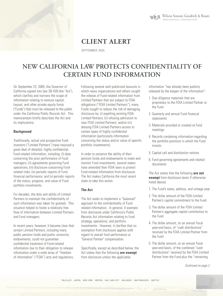 CLIENT ALERT SEPTEMBER 2005NEW CALIFORNIA LAW PROTECTS CONFIDENTIALITY OF CERTAIN FUND INFORMATION On September 22, 2005, the Governor of California signed into law SB 439 (the “Act “), which