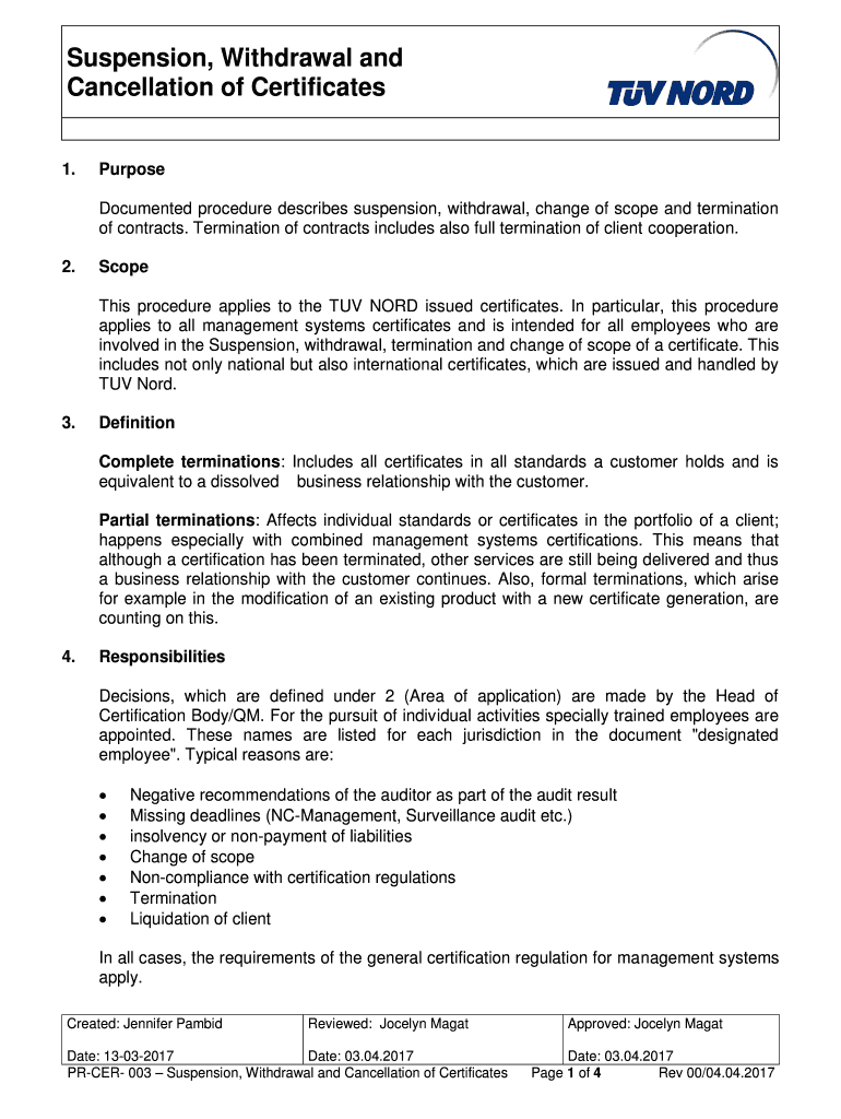 Documented procedure describes suspension, withdrawal, change of scope and termination