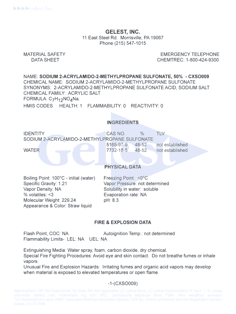 Ge lest, Inc. GEL EST, INC. 11 East Steel Rd. Mooresville, PA 19067 Phone (215) 5471015 MATERIAL SAFETY DATA SHEETEMERGENCY TELEPHONE CHESTER: 18004249300NAME: SODIUM 2ACRYLAMIDO2METHYLPROPANE SULFONATE,