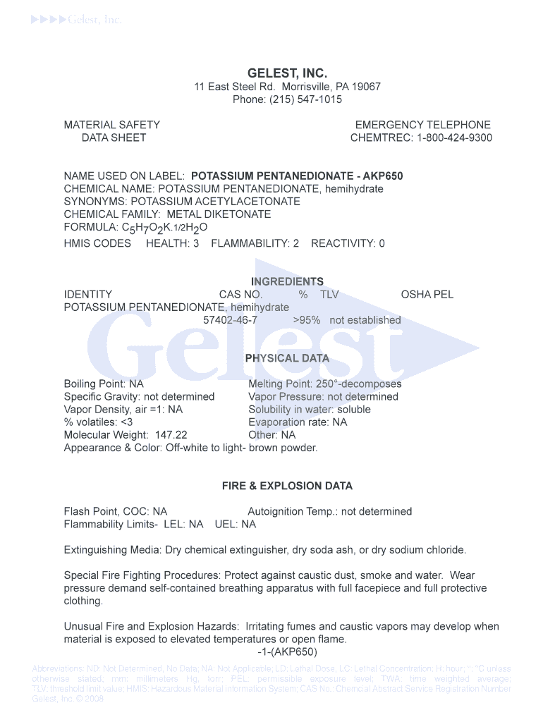 Ge lest, Inc. GEL EST, INC. 11 East Steel Rd. Mooresville, PA 19067 Phone: (215) 5471015 MATERIAL SAFETY DATA SHEETEMERGENCY TELEPHONE CHESTER: 18004249300NAME USED ON LABEL: POTASSIUM PENTANEDIONATE