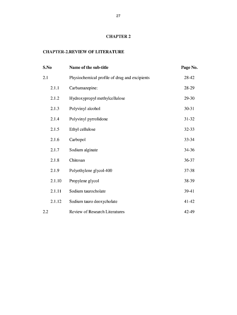 27CHAPTER 2CHAPTER2.REVIEW OF LITERATURES. Nonage of the subtitle2.1Physiochemical profile of drug and excipients28422.1.1Carbamazepine:28292.1.2Hydroxypropyl methylcellulose29302.1.3Polyvinyl alcohol30312.1.4Polyvinyl