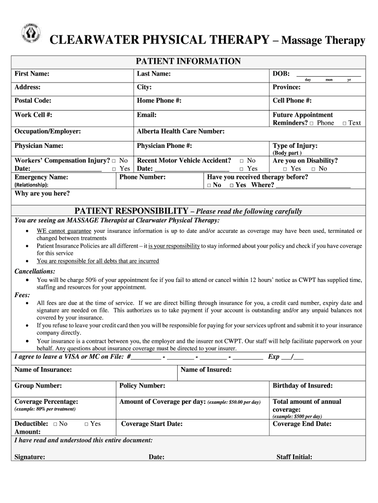 CLEARWATER PHYSICAL THERAPY Massage Therapy PATIENT INFORMATION First Name:Last Name:DOB: daymonAddress:City:Province:Postal Code:Home Phone #:Cell Phone #:Work Cell #:Email:Future Appointment Reminders?