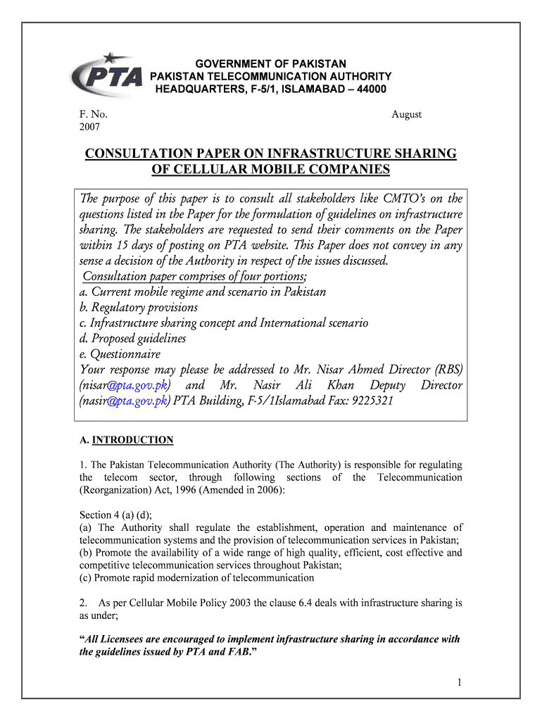 GOVERNMENT OF PAKISTAN TELECOMMUNICATION AUTHORITY HEADQUARTERS, F5/1, ISLAMABAD 44000 F. No. 2007AugustCONSULTATION PAPER ON INFRASTRUCTURE SHARING OF CELLULAR MOBILE COMPANIES The purpose of this