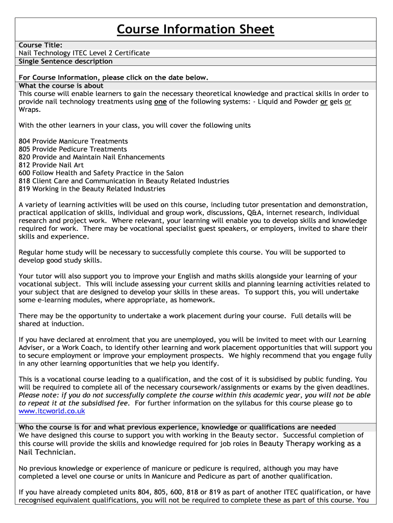 Course Information Sheet Course Title: Nail Technology ITEM Level 2 Certificate Single Sentence description For Course Information, please click on the date below. What the course is about This course