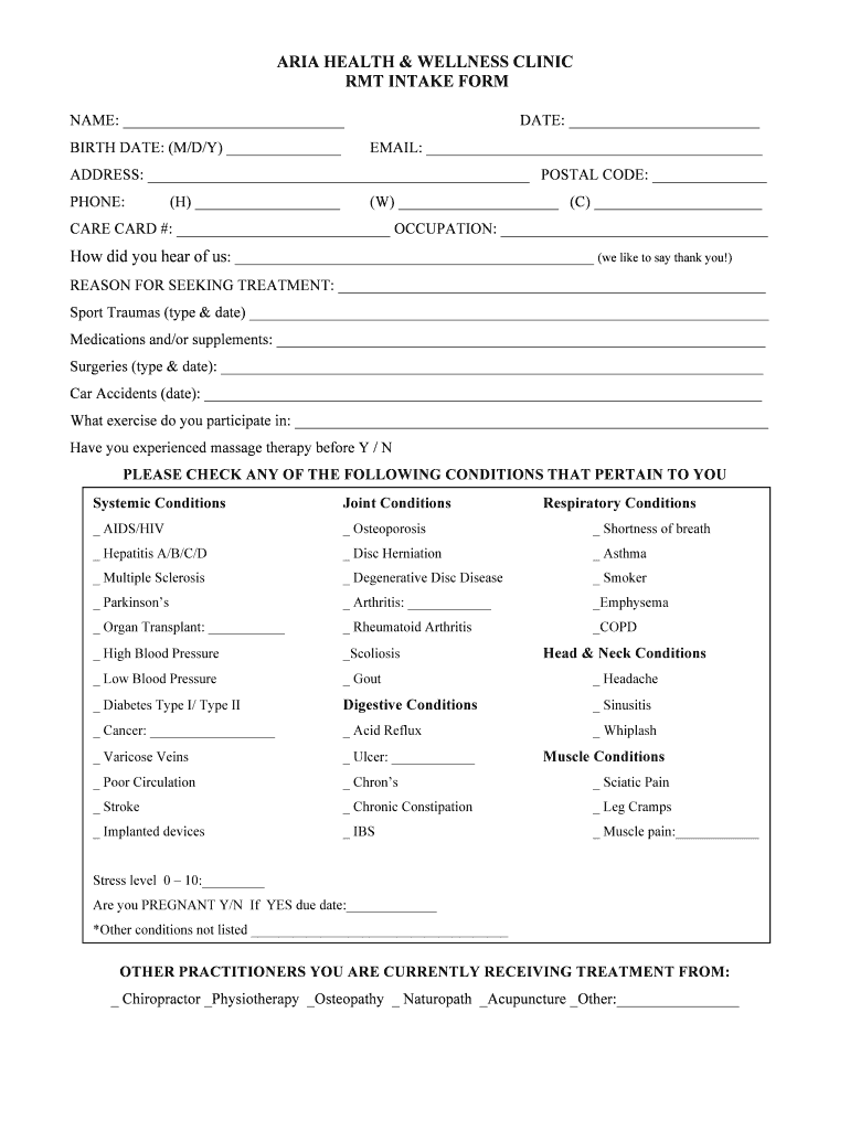 ARIA HEALTH & WELLNESS CLINIC RAT INTAKE FORM NAME: DATE: BIRTH DATE: (M/D/Y) EMAIL: ADDRESS: POSTAL CODE: PHONE:(H) (W) (C) CARE CARD #: OCCUPATION: How did you hear of us: (we like to say thank