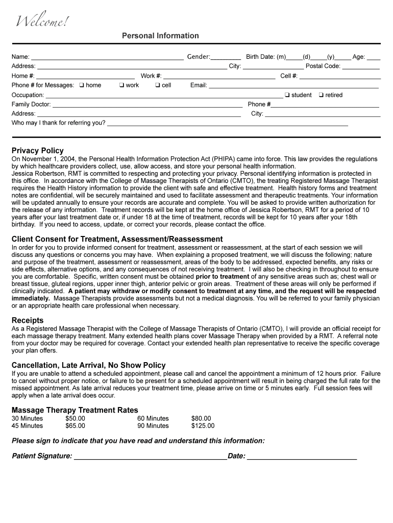 Welcome! Personal Informational: Gender: Birth Date: (m) (d) (y) Age: Address: City: Postal Code: Home #: Work #: Cell #: Phone # for Messages: homework cell Email: Occupation: student retired Family