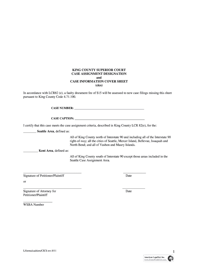 KING COUNTY SUPERIOR COURT CASE ASSIGNMENT DESIGNATION and CASE INFORMATION COVER SHEET (CICS) In accordance with LCR82 (e), a faulty document fee of $15 will be assessed to new case filings missing