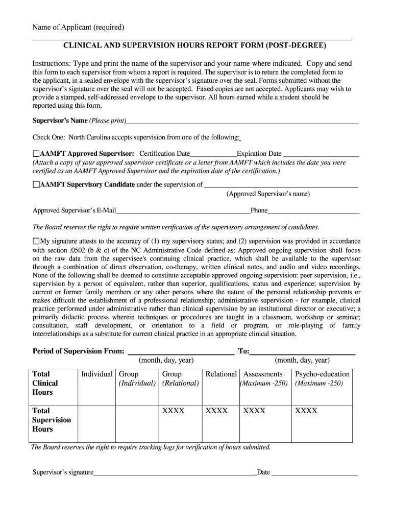 Applicants in North Carolina who are recording clinical and supervision hours earned during their education, along with their supervising professionals, are eligible to use this form.