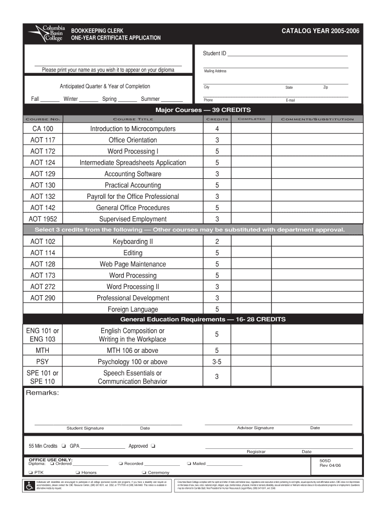 CATALOG YEAR 2005-2006 BOOKKEEPING CLERK ONE-YEAR CERTIFICATE APPLICATION Student ID Please print your name as you wish it to appear on your diploma Mailing Address Anticipated Quarter & Year of Completion